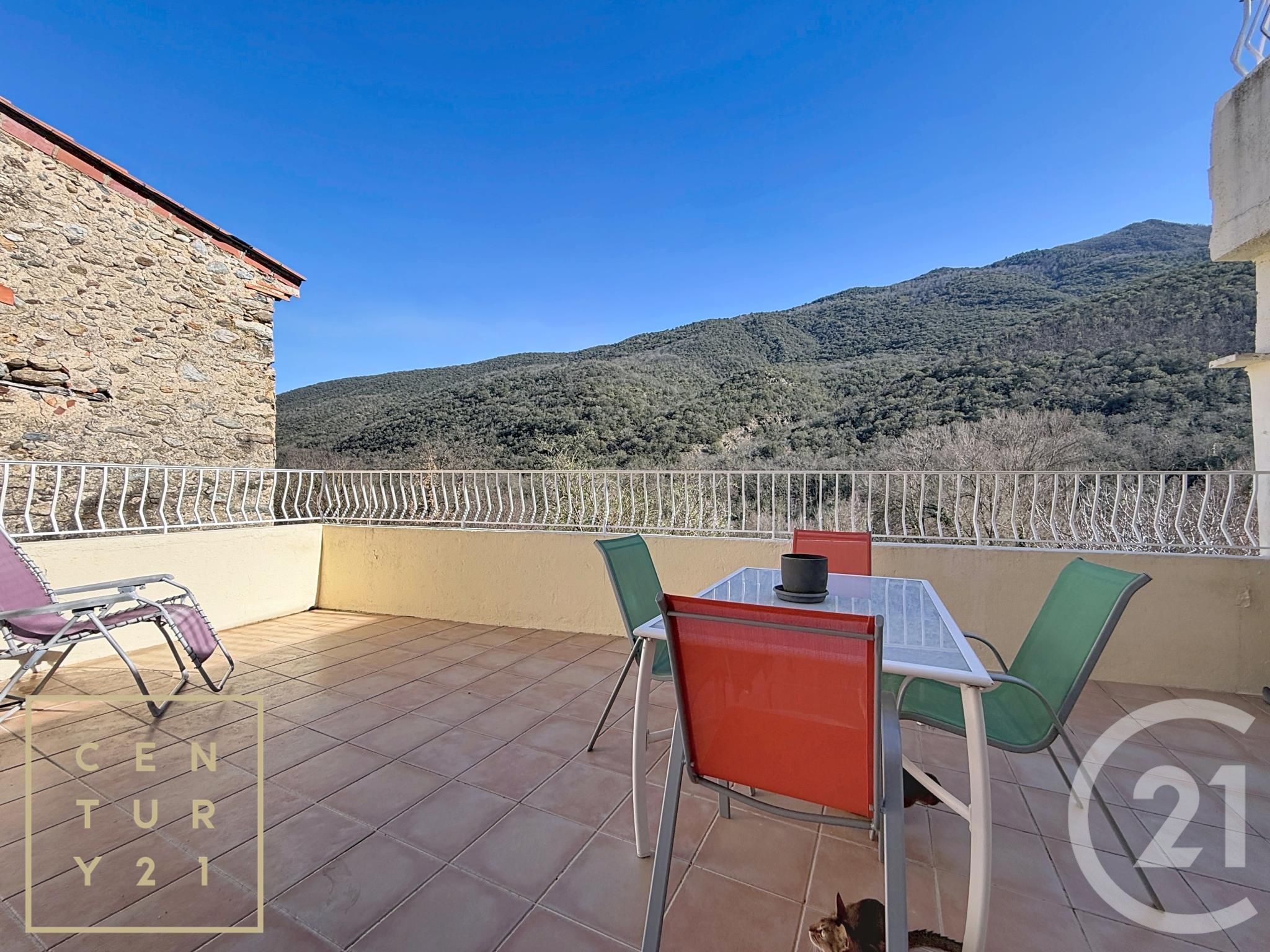 À l'étage, le second appartement comprend trois chambres aux volumes équilibrés, un WC indépendant ainsi qu'une salle d'eau. Le séjour avec cuisine ouverte forme un espace chaleureux et fonctionnel, bénéficiant d'un accès direct à une seconde terrasse carrelée, offrant un espace extérieur supplémentaire avec vue dégagée.